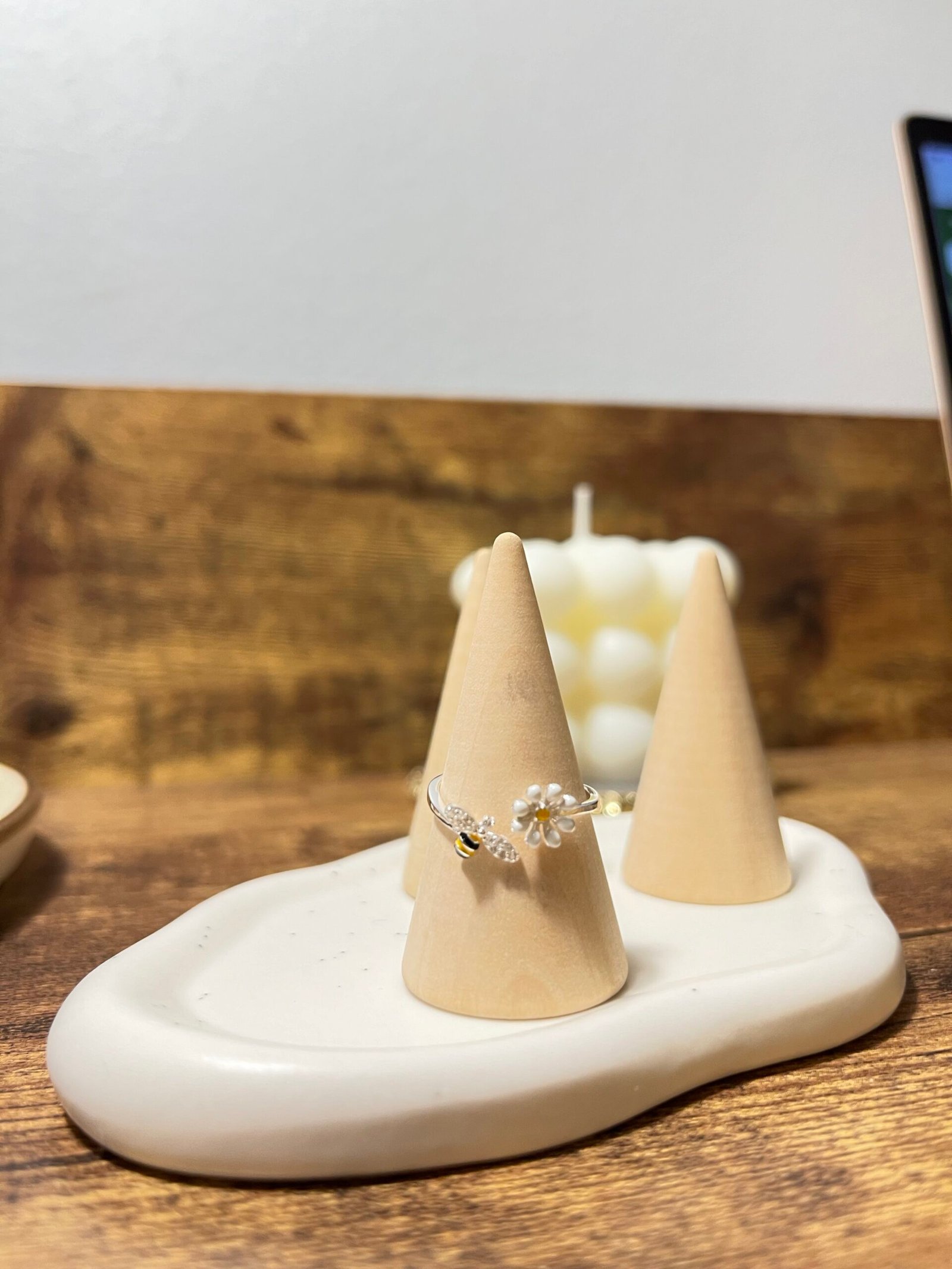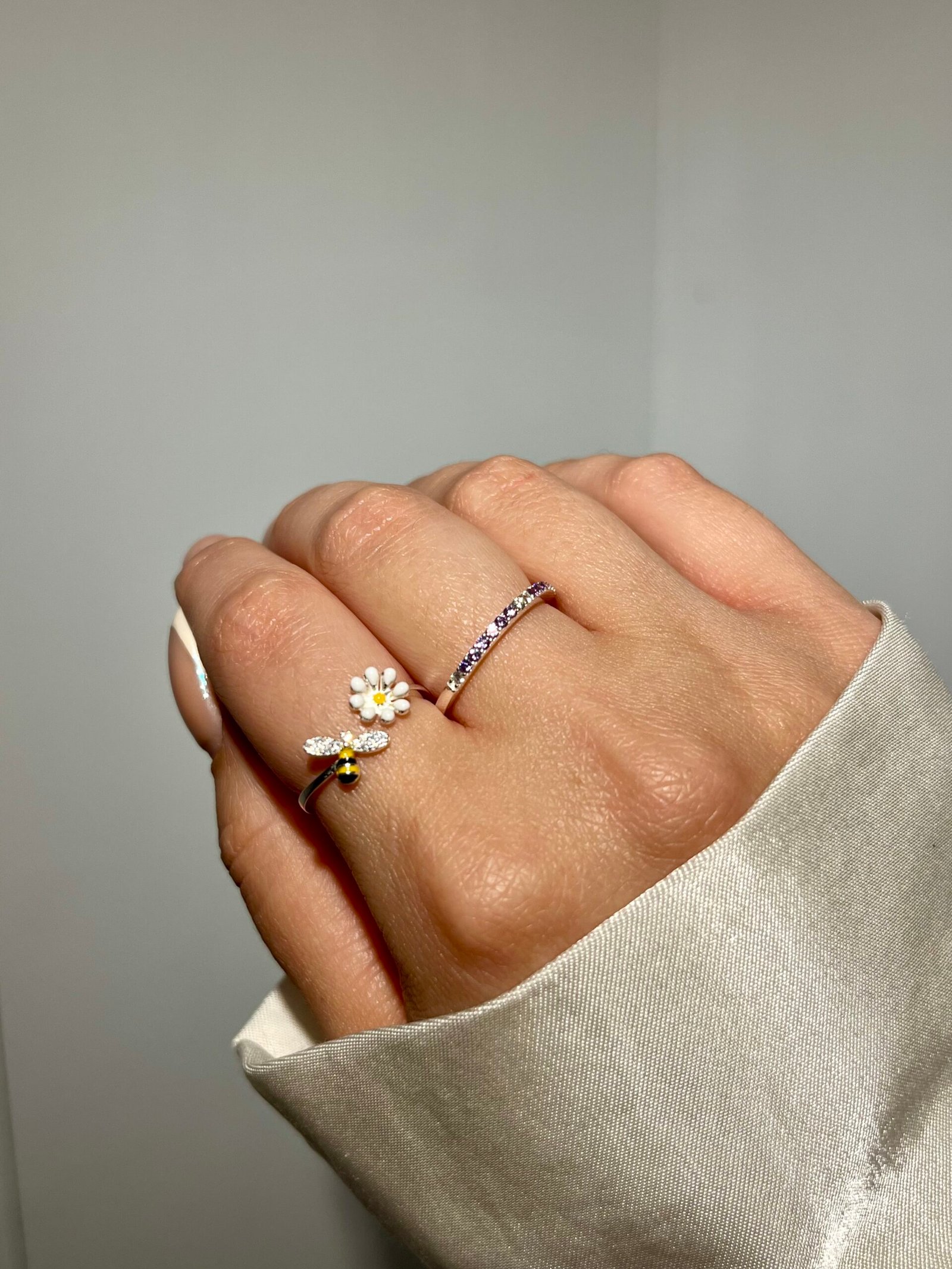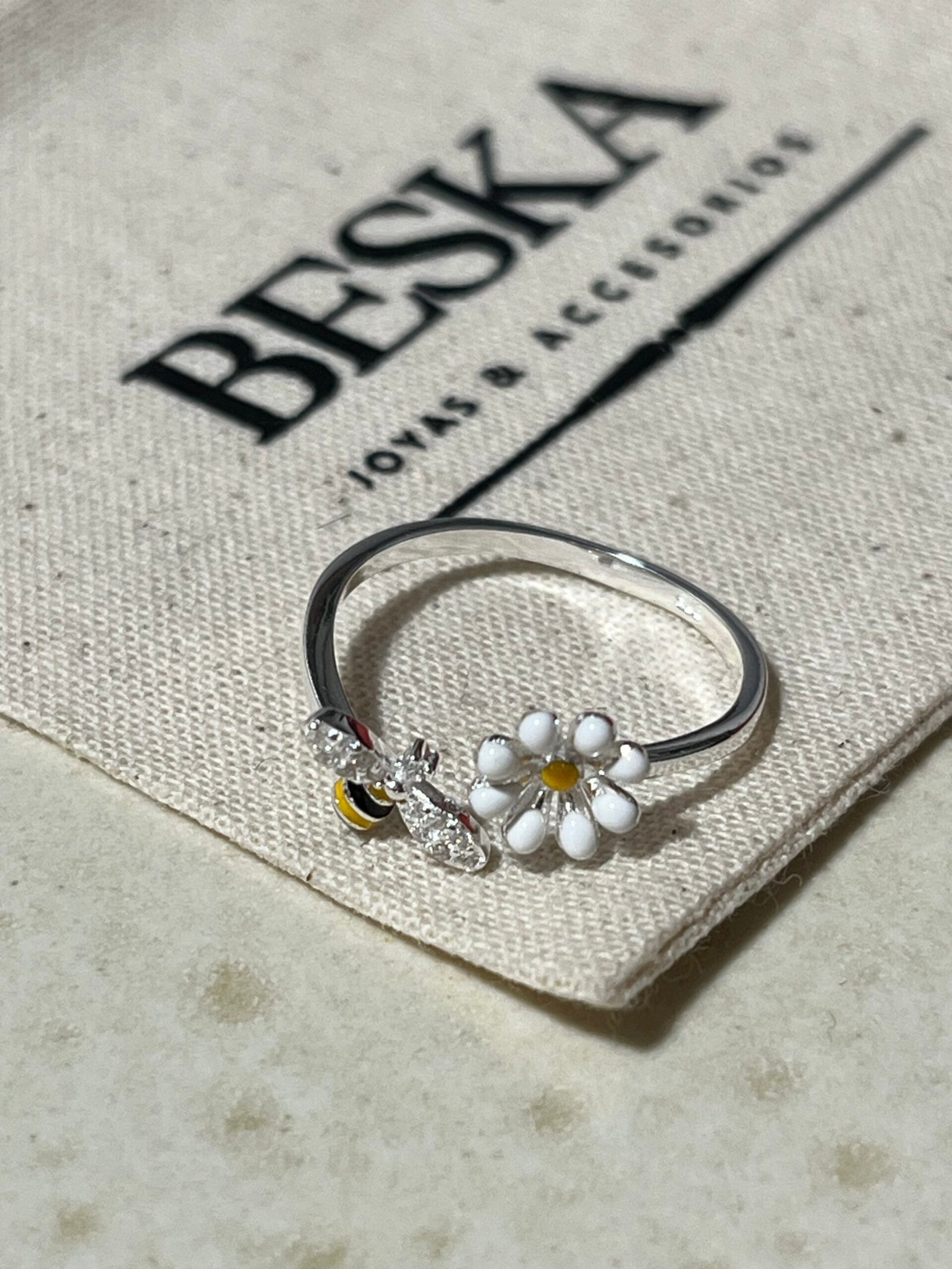 El anillo Abeja con Margarita, representa la belleza y el encanto de la naturaleza. Presenta una abeja esmaltada con brillantes micro circones en sus alas, acompañada de una flor de margarita esmaltada.
