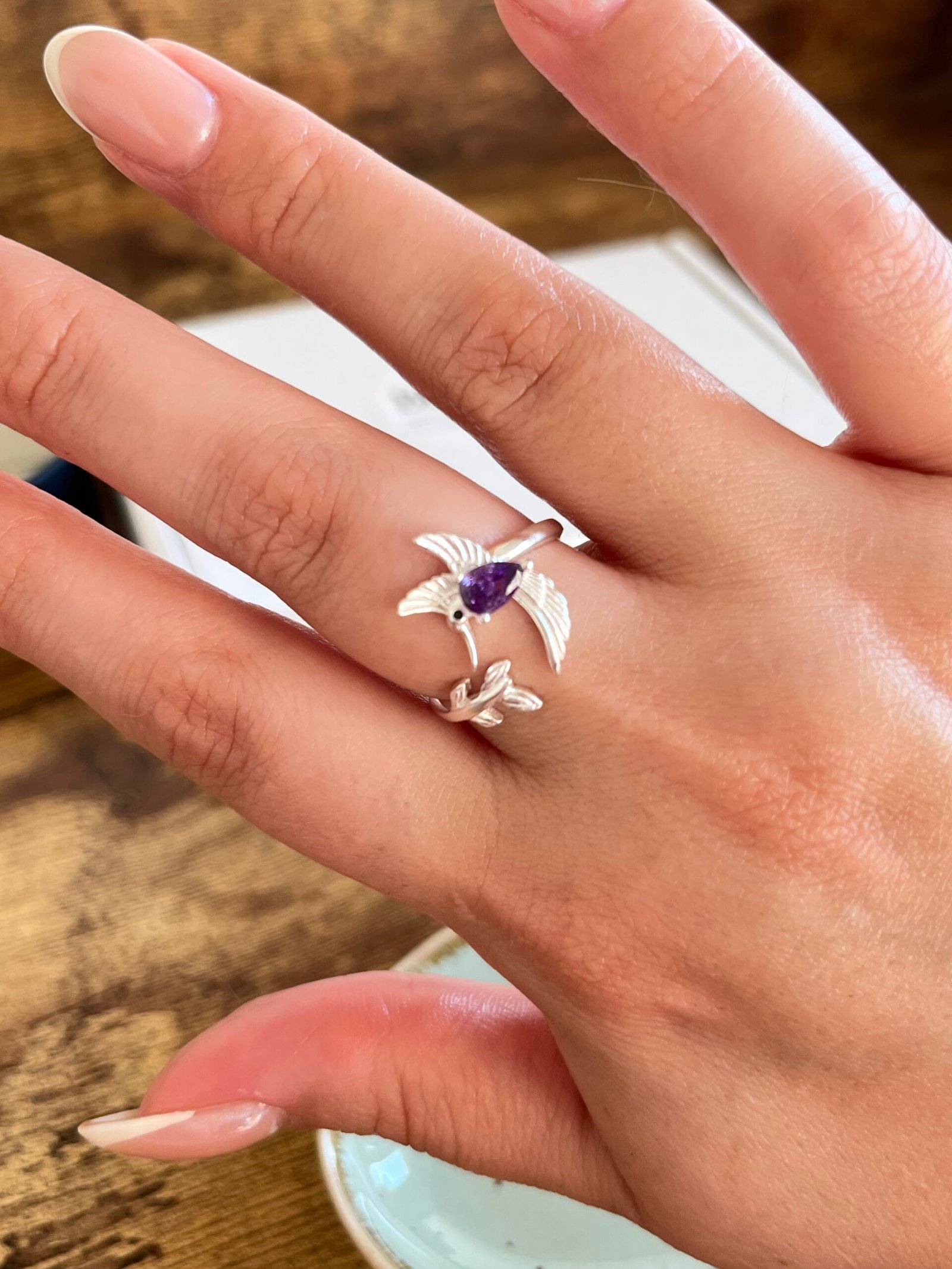 Anillo Colibrí Circón Morado. Adaptable desde la talla 14 a 20. Plata ley 925