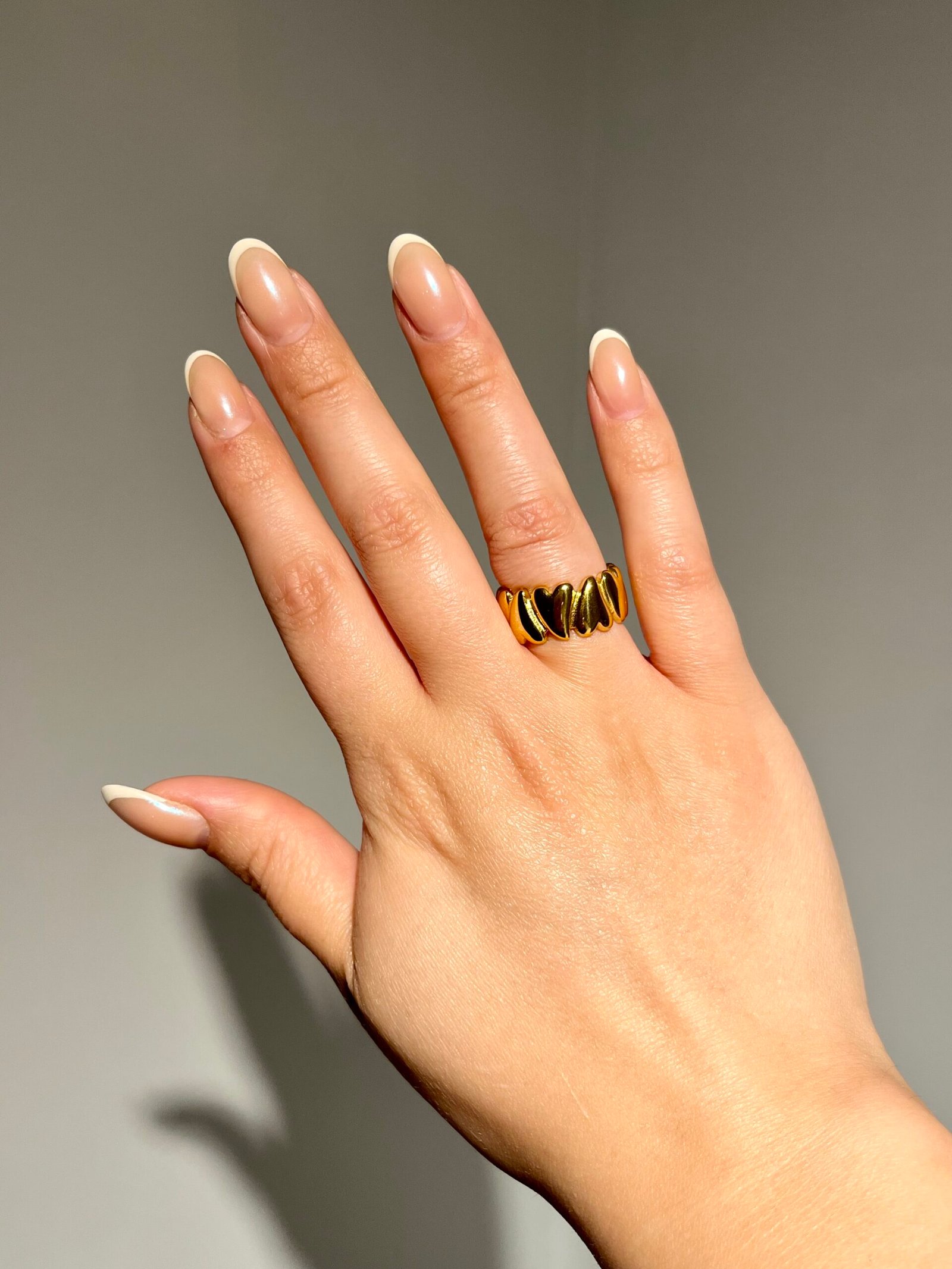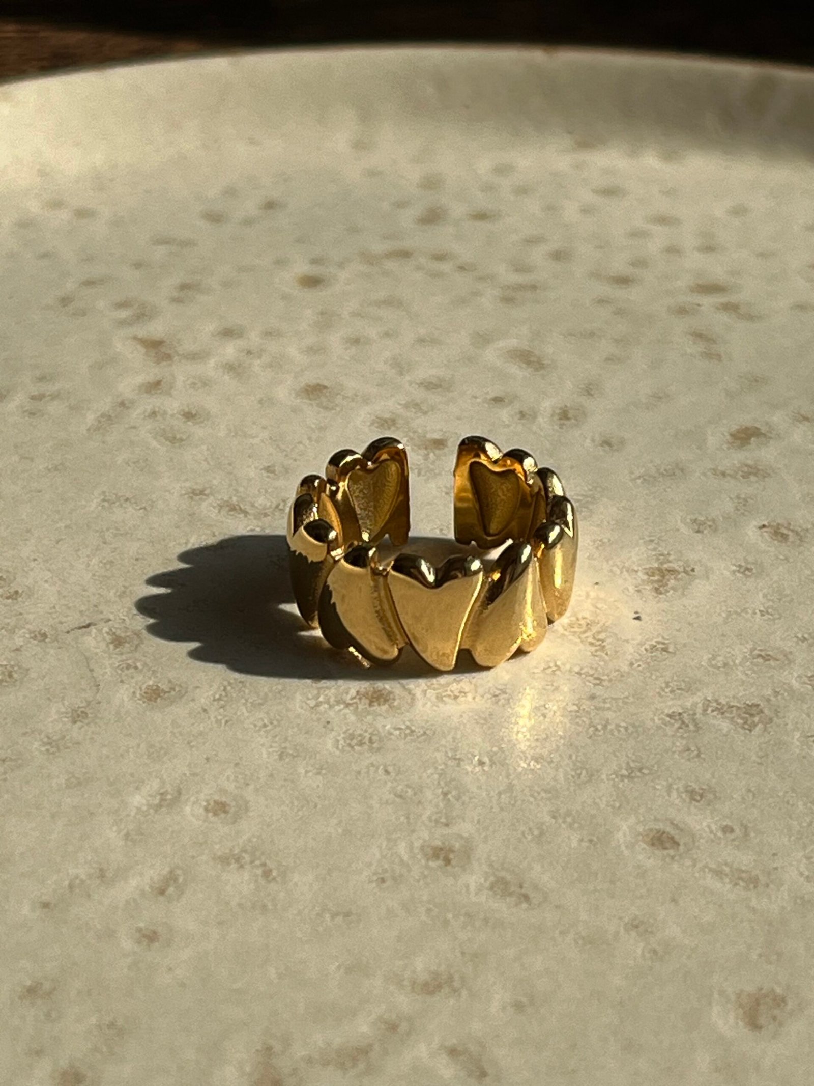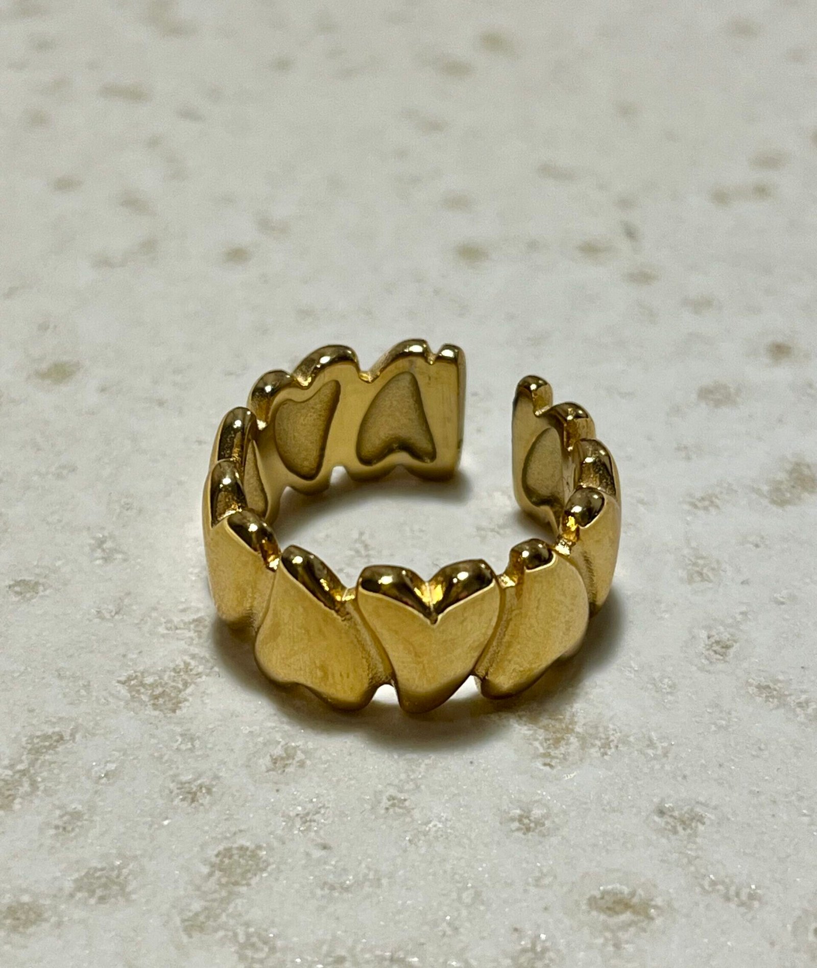 Anillo Corazones Conectados Dorado. Es un anillo con un diseño de múltiples corazones conectados en fila, lo que le da un aspecto elegante y romántico. Perfecto para llevar en ocasiones especiales o como un elegante complemento diario, este anillo es un símbolo de amor y elegancia