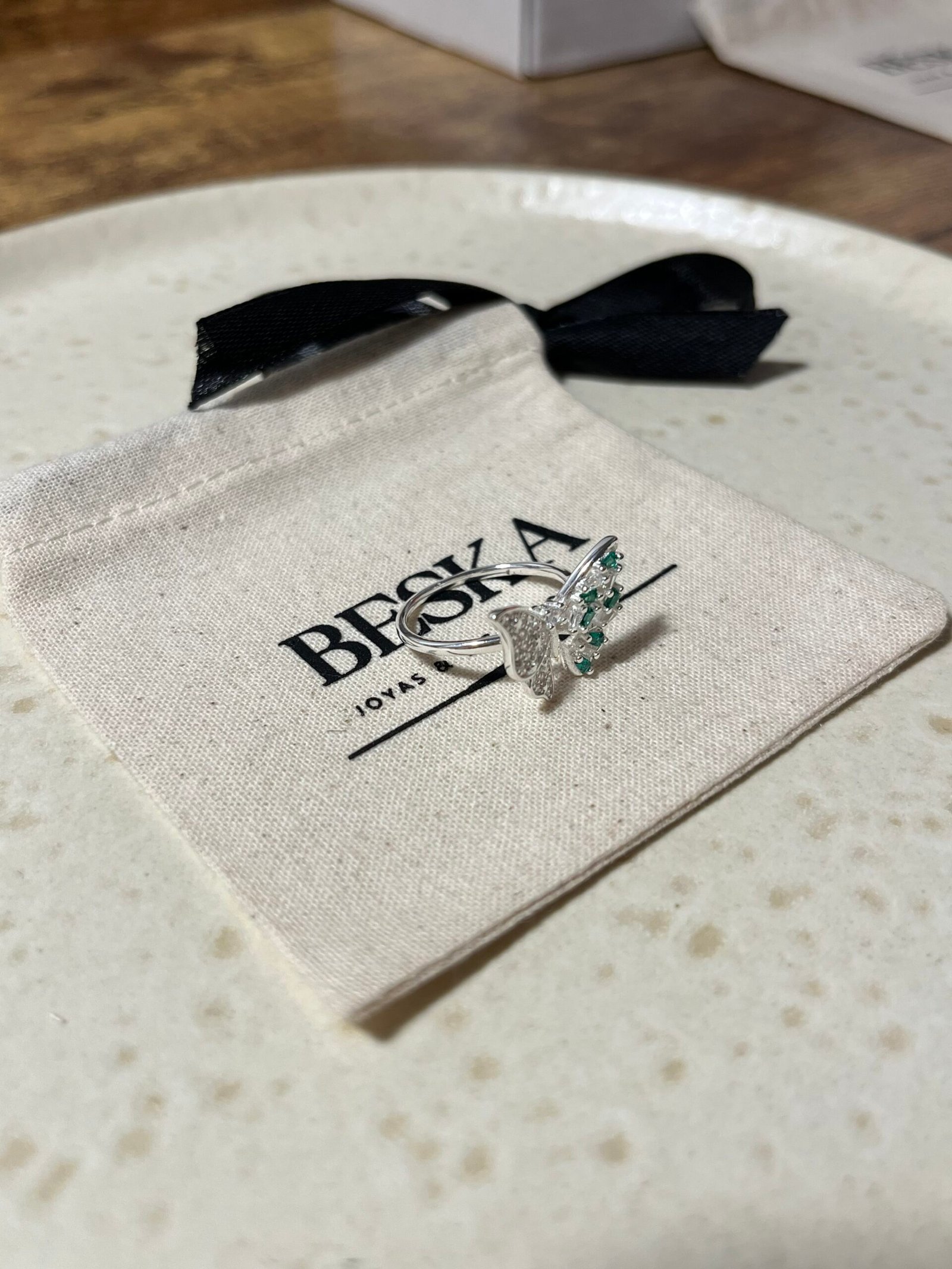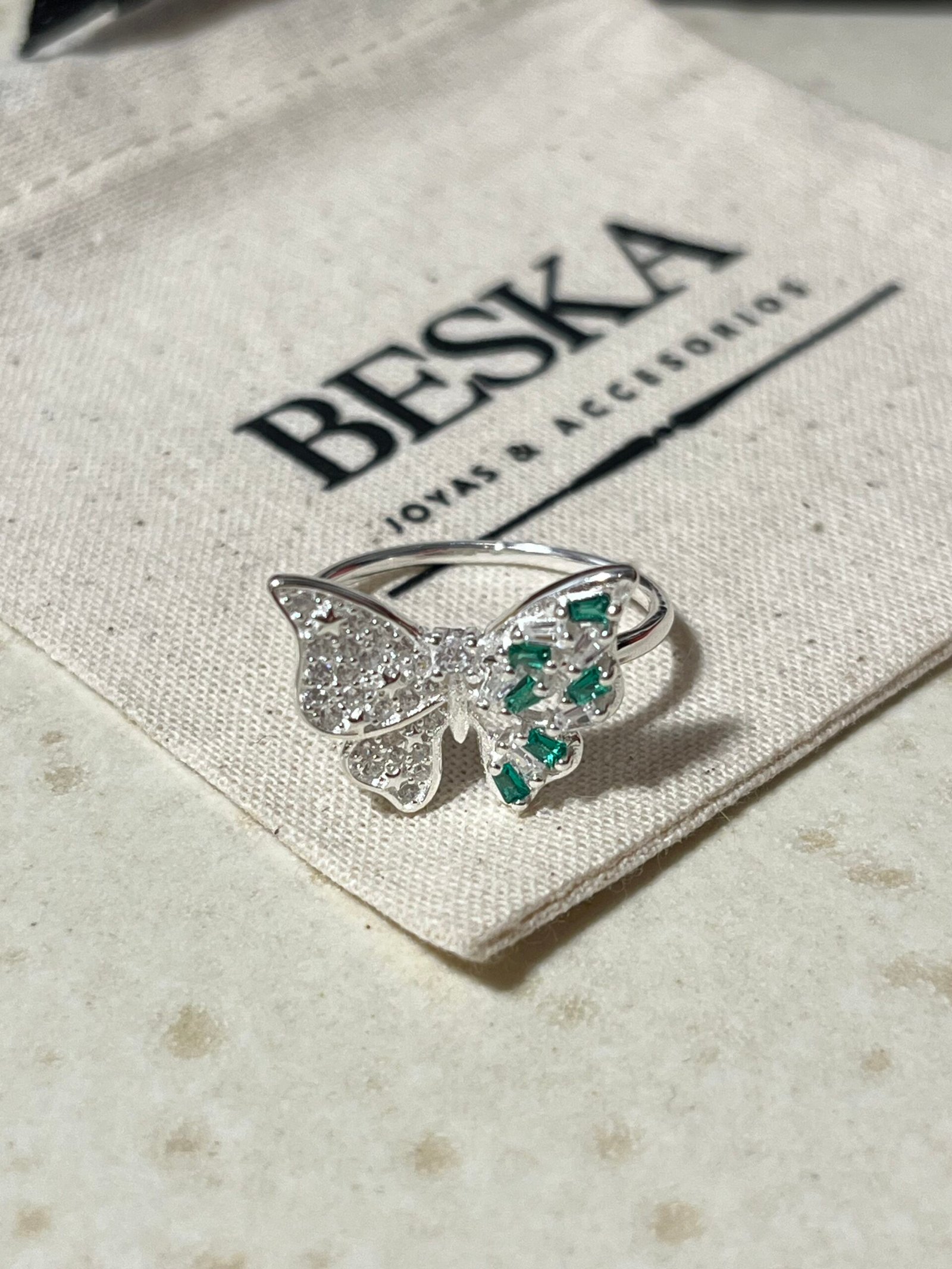 Anillo Mariposa con Circones y Esmeraldas. Este anillo de mariposa captura la delicadeza y la gracia de una mariposa en vuelo. Las piedras brillantes transparentes y verdes se combinan armoniosamente para crear un contraste llamativo que atraerá todas las miradas. Perfecto para llevar en ocasiones especiales para dar personalidad y audacia a tu look.