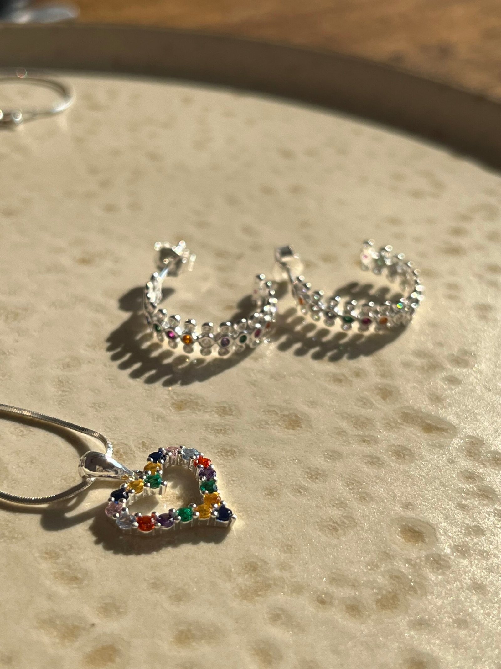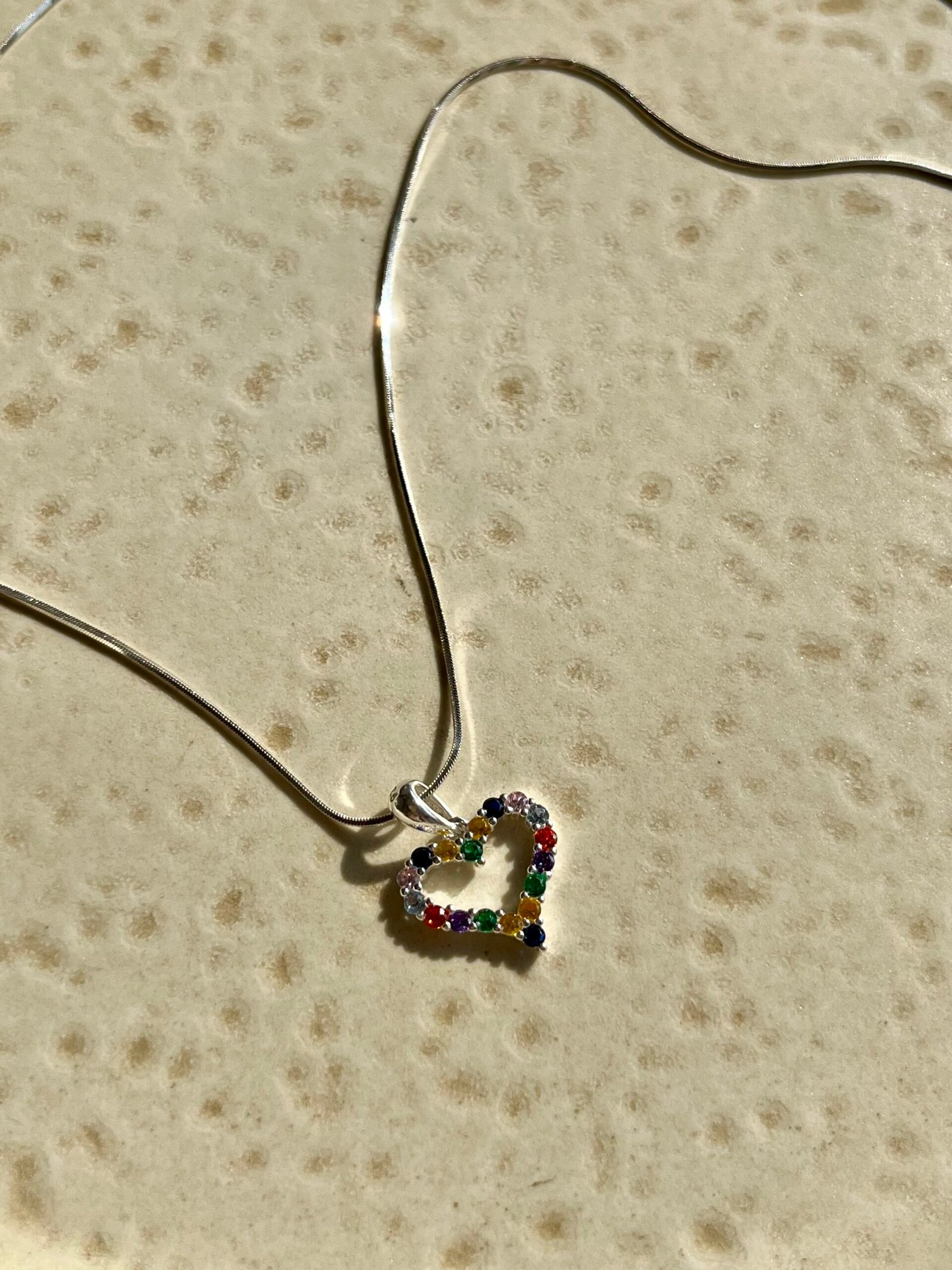 El collar Corazón Arco Iris, tiene una delicada y elegante cadena de cinta con un colgante en forma de corazón con brillantes circones de colores. Perfecto para llevar en ocasiones especiales o como un delicado complemento diario.