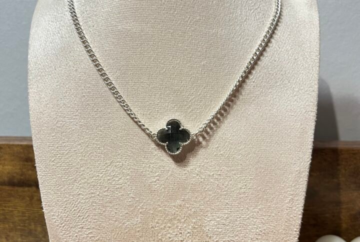 El collar Eterna Fortuna Black, es de plata 925, cuenta con una cadena tipo grumet, que se caracteriza por sus eslabones planos y entrelazados. Tiene un colgante en forma de trébol de cuatro hojas de color negro.