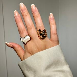 Anillo con forma de corazón de nácar. Este anillo presenta un encantador corazón de nácar, enmarcado en una fina silueta de oro que realza su brillo natural y suave iridiscencia. Perfecto para llevar en ocasiones especiales o como un elegante complemento diario, este anillo es un símbolo de amor y elegancia